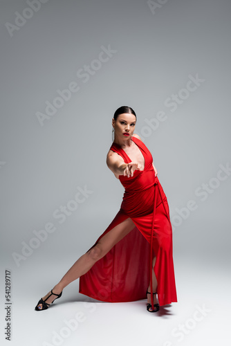 Full length of ballroom dancer in red dress looking at camera on grey background