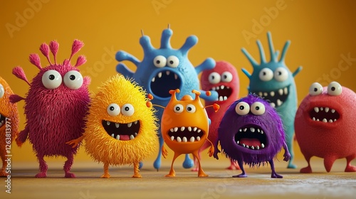 Fun virus character set in bright colors, some with happy faces and some with angry expressions, ideal for children's learning visuals