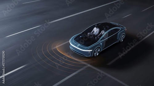 Futuristic autonomous car driving on a dark road with sensor waves