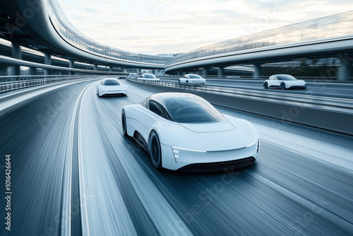 Futuristic autonomous cars driving on a modern highway with multiple lanes and elevated roadways, showcasing advanced transportation technology.
