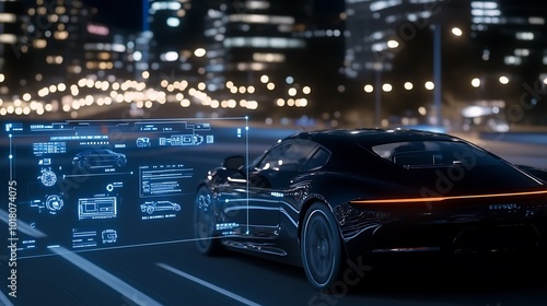 Futuristic Car with Advanced Technology Displaying Digital Information on a Night Drive