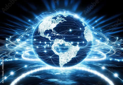 Futuristic Global Network with Illuminated Earth and Streamlined Connections Depicting Digital Communication and Technological Advancement Concepts