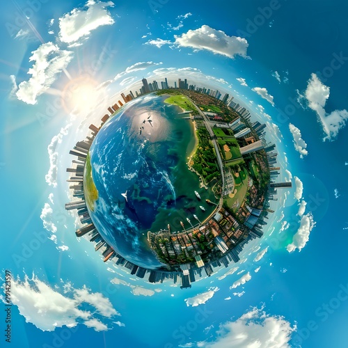 Futuristic Globe Concept Art with Urban Skyline Encompassing Nature and Technology. A Creative Take on Eco Cities. Surreal World Imagery. AI