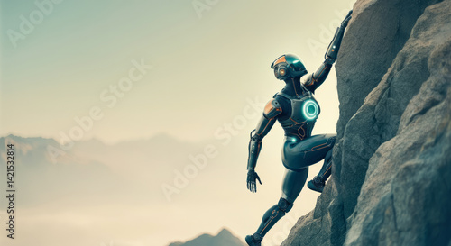 Futuristic robot scaling mountain cliff in advanced sci-fi gear