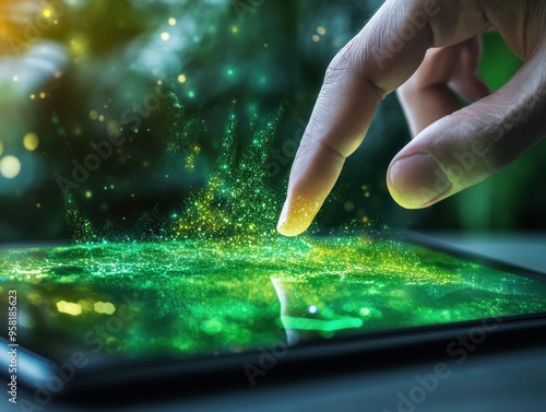 Futuristic Touchscreen Interaction with Glowing Green and Yellow Digital Particles in a Dark Environment