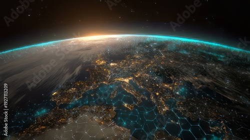 Futuristic view of planet Earth at night showcasing glowing continents and interconnected global digital network infrastructure from space.