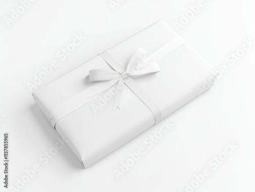 Gift mockup in white wrapping paper with a bow on white background. Minimalist and elegant packaging design.