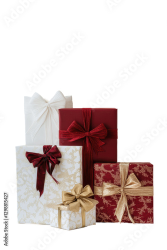 Gifts wrapped in festive colors and decorative bows stacked together on white background for Christmas, holidays, celebrations, and special occasions.
