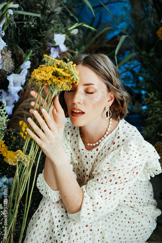 Girl model with beautiful hairstyle and makeup in a white dress with flowers in a fashion-style room for vogue magazine