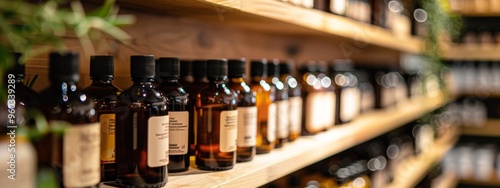 Glass bottles of herbal oils neatly arranged on wooden shelves