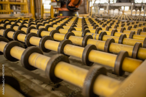 Glass conveyor line. Glass factory, industrial production of glass containers. Technological work on factory