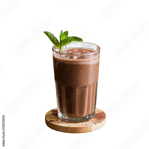 Glass of mint chocolate drink topped with fresh mint leaves and chocolate flakes, creamy and refreshing dessert beverage, Isolated Transparent Background