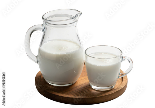 Glass pitcher and cup filled with milk presented on a wooden tray on transparent background