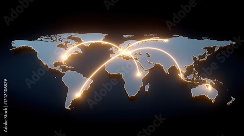 Global Connectivity Map with Illuminated Connections Highlighting International Interactions and Travel Routes
