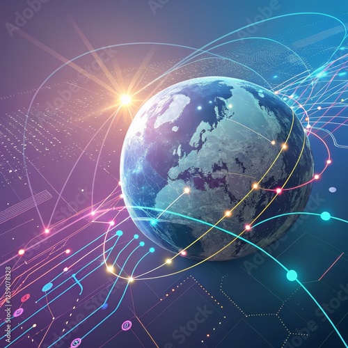 Global Network Earth, Lines, Nodes, Sunburst Composition, Digital Connections, Abstract Artwork Global Network, Digital Art