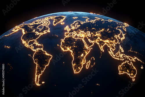 Global night view illuminated with city lights, vibrant continents outlined by glowing urban areas, ideal for discussing global connectivity.