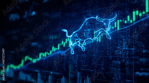 Glowing Bull Symbol with Rising Stock Charts and Financial Data in Futuristic Market Growth Concept