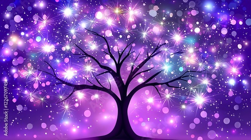 Glowing purple star tree, night sky bokeh, fantasy, design