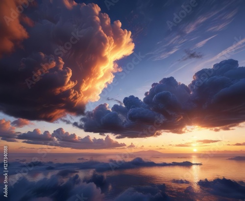 Golden hues of sunset blend with cobalt blue clouds, golden hour, weather phenomenon, nature scene