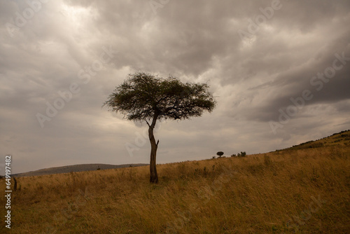Golden meadows in the savanna fields in Kenya, Africa. African Savannah Landscape in Masai Mara National Reserve.