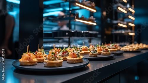 Gourmet Canapes at a Sophisticated Event.Concept of Fine dining,culinary artistry, event catering,luxury lifestyle,Catering companies,event planners,luxury hotels,high-end restaurants.