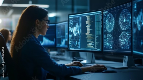 Graphic designer editing on a computer in a modern, collaborative workspace, showing side view with office ambiance and creative decor.