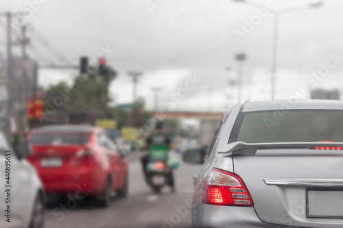 Gray car with raindrops on the road by rush hour or traffic jam in Thailand.