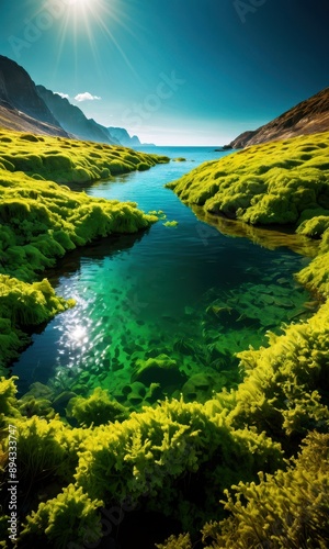 Green Algae Filled Lagoon in Mountains.