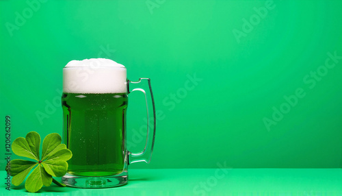 Green beer with shamrock on vibrant backdrop, St. Patrick's Day celebration