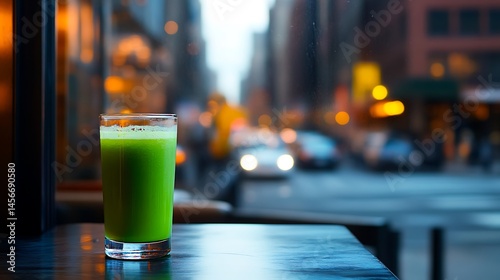 Green juice on a table, city background