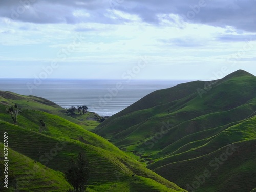 Green rolling hills leading to the ocean