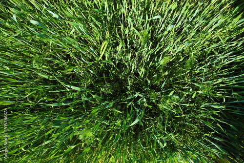 Green wheat sprouts close-up. Field of young grain crops top view.