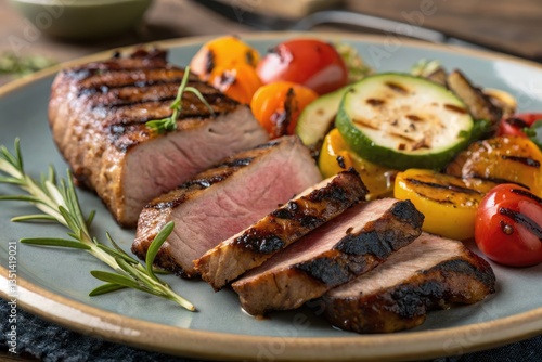 Grilled Steak Served With Roasted Vegetables on a Blue Plate Generative AI