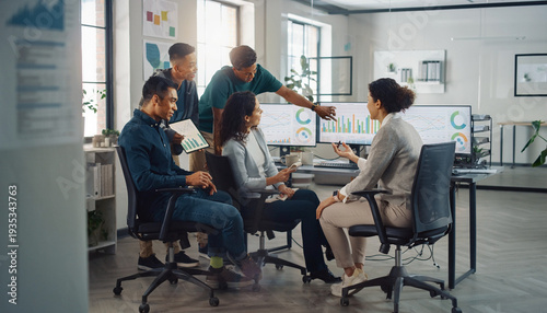 Group of colleagues gathered around office desk analyzing company performance data on multiple displays while woman leads discussion and team members listen attentively during tactical project meeting