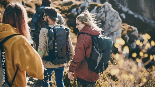 Group of hikers enjoying a sunny day on a scenic mountain trail, surrounded by autumn foliage.