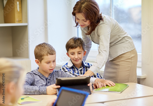 group of school kids writing test in classroom