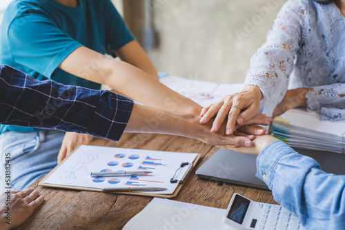 Group of young businessmen in Asian suits clasping hands Stack your hands to brainstorm to complete tasks on a given project. Passionate and excited about their work, and success concept.