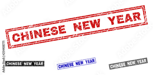 Grunge CHINESE NEW YEAR rectangle stamp seals isolated on a white background. Rectangular seals with grunge texture in red, blue, black and gray colors.