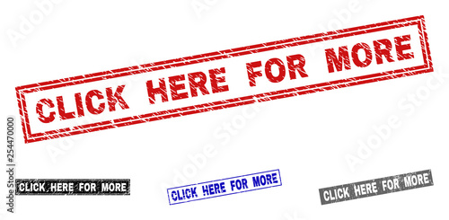 Grunge CLICK HERE FOR MORE rectangle stamp seals isolated on a white background. Rectangular seals with distress texture in red, blue, black and gray colors.