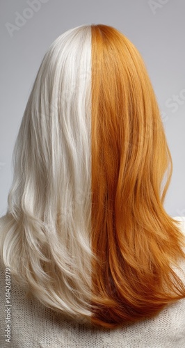 Half-blonde, half-ginger hair; studio shot; rear view; hair color comparison; beauty