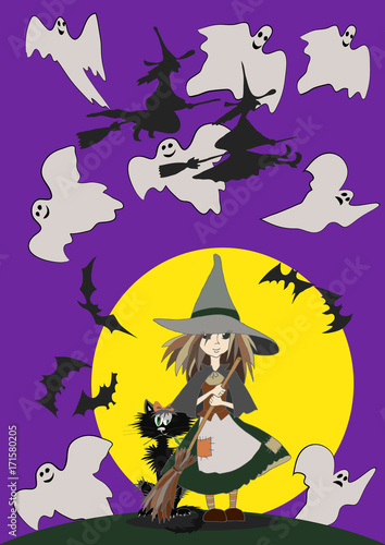 Halloween poster / card/ background. Little witch and her black cat.