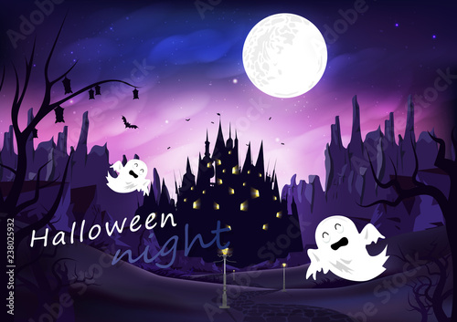 Halloween, spooky on the road with castle, fantasy miracle silhouette night scene poster, mountains landscape abstract background vector illustration