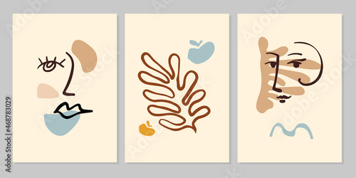 Hand drawn abstract modern minimal set of covers with colorful shapes, fruit, leaf, faces on beige background. Vector flat illustration. Design for poster, card, wallpaper, print, cover, wall art