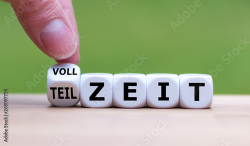 Hand dreht einen Würfel und ändert das Wort "Teilzeit" in "Vollzeit" (oder umgekehrt).