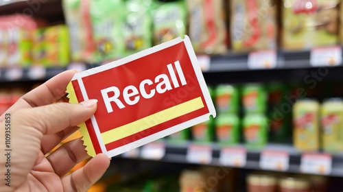 Hand holding a "Recall" sticker on a packaged food item, highlighting the importance of food safety and consumer protection in product management.