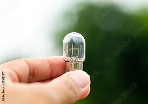 hand holds up the not lighting lamp for can't think any idea concept in the sky & white background taken by macro photography.
