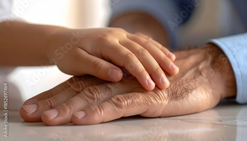 Hand in Hand, A bond of generations: A tender moment unfolds as the youthful hand gently rests on the aged hand, symbolizing the connection between generations. The picture portrays support.