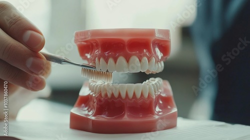 Hands of dentist doctor showing how to brush teeth using jaw model, cropped