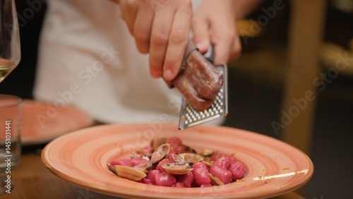 Hands Of The Waiter Grating Bottarga Over The Dumplings Gourmet Dish