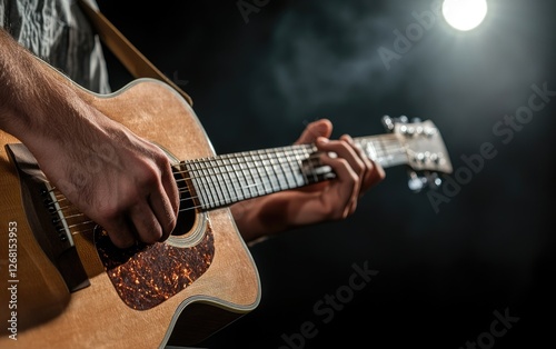 Hands strumming an acoustic guitar under soft, focused lighting create a captivating atmosphere during a nighttime performance. The ambiance enhances the musical experience